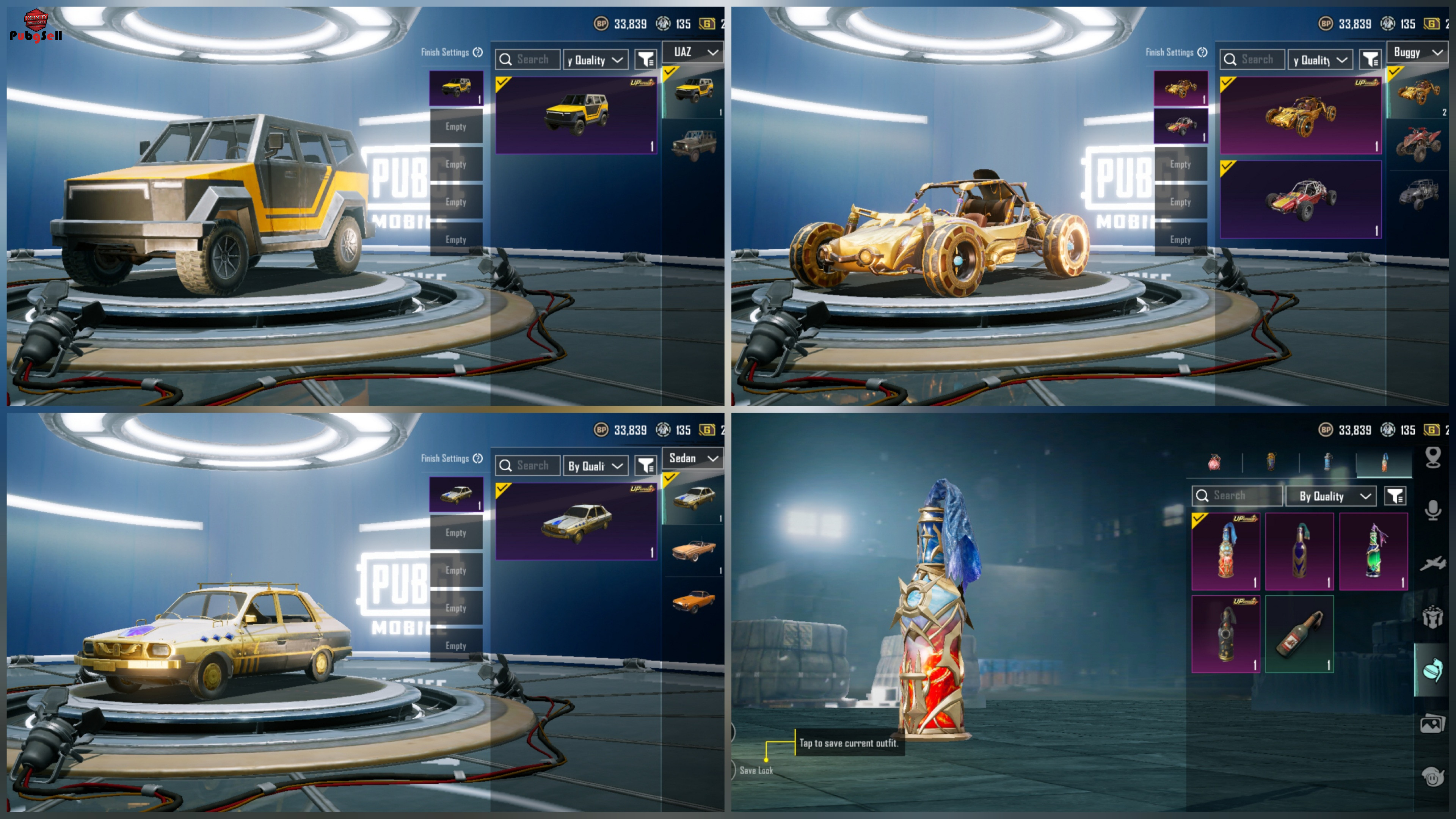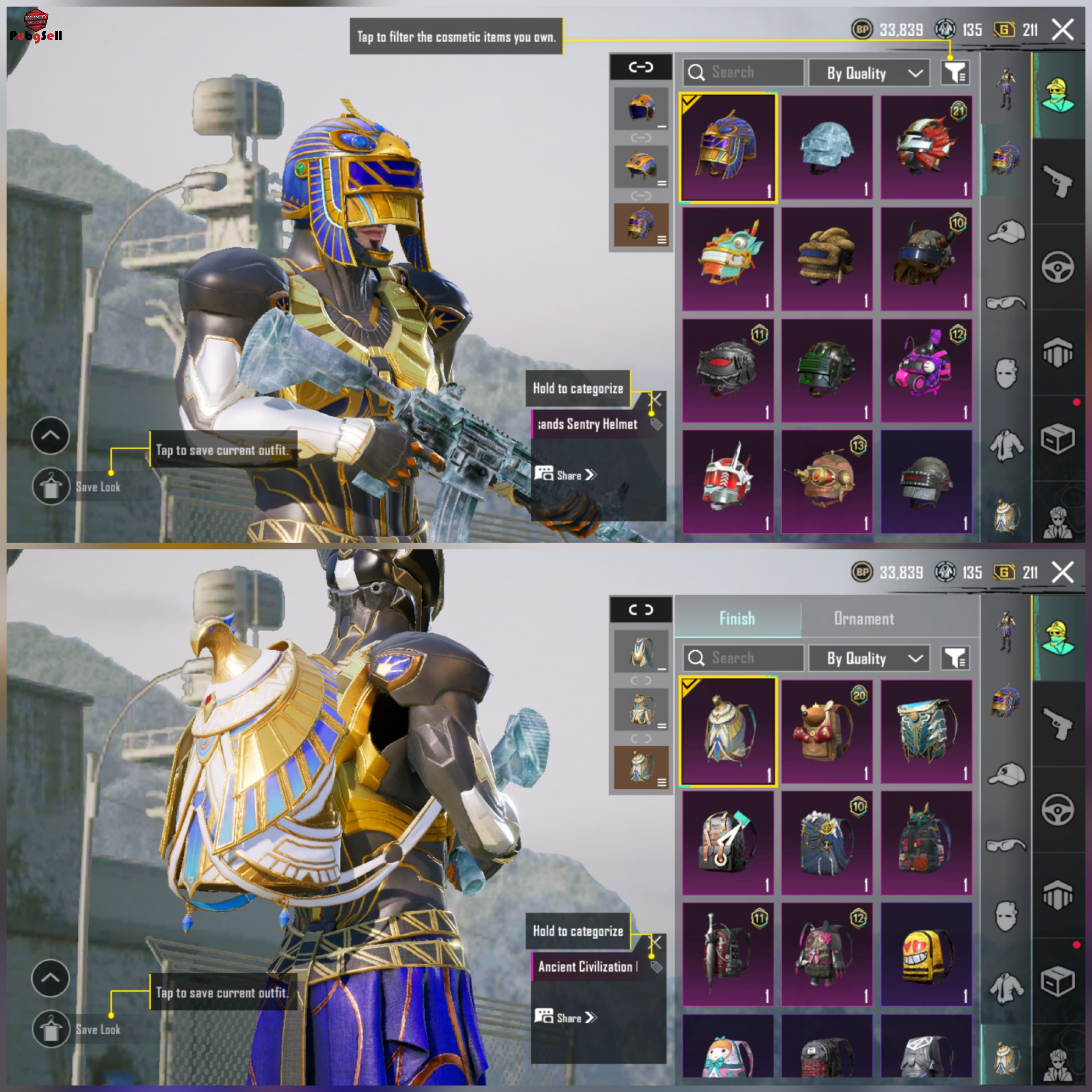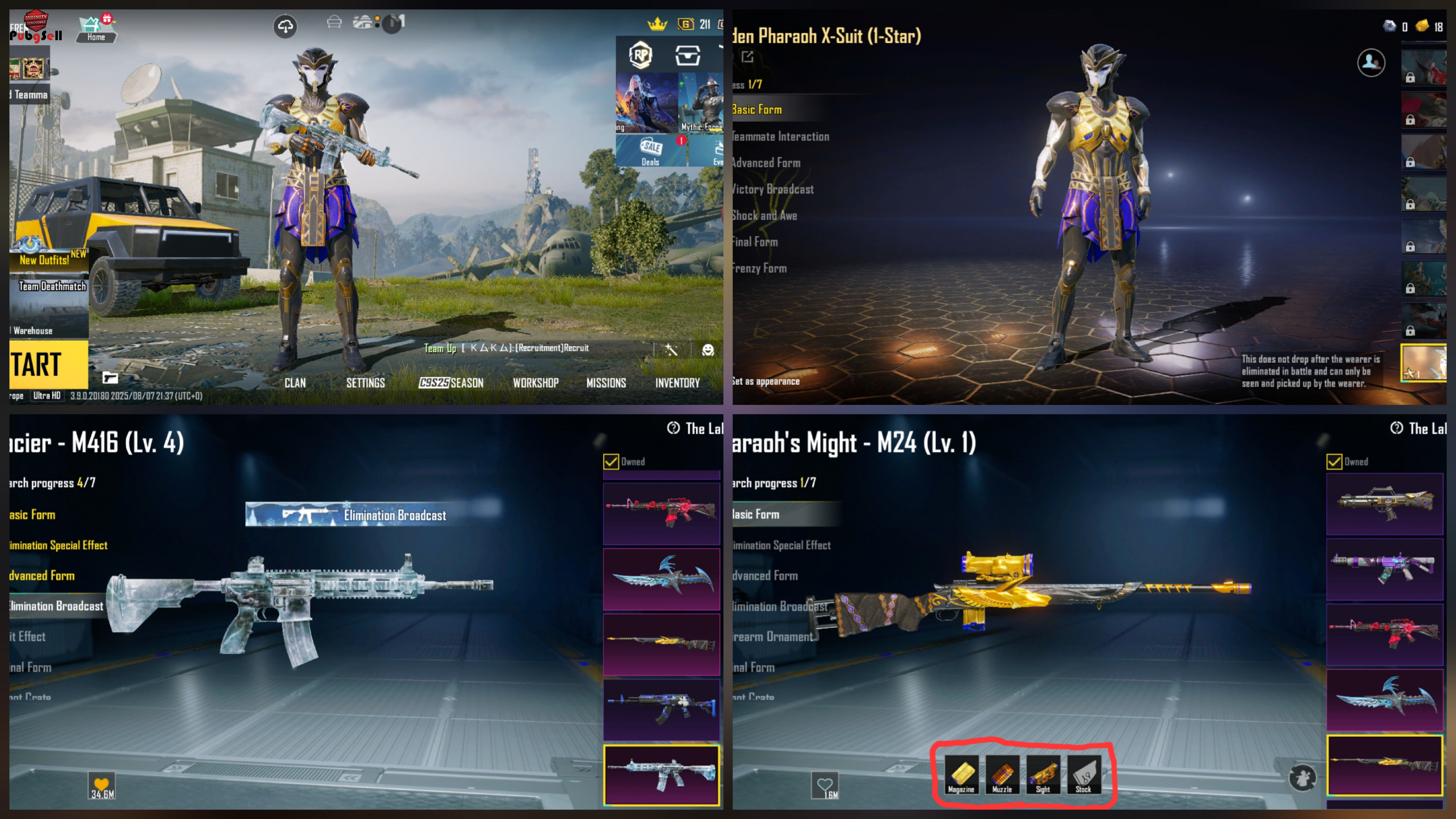 ست آپگریدی فرعون لول 1 امفور یخی لول 4 کیل مسیج ام 24 لول یک(با اسکین چند تا از اتچمنتاش) ام 700 یونیکرون لول یک اسکین نایف(چاقو)مکس کیل مسیج و سه تا گان آپگریدی دیگه در کل 7 تا گان آپگریدی 2 تا کیل مسیج ست متیک زن فرعون ست متیک آرپی سیزن 6 بکپک فرعون هلمت فرعون و یخی 3 تا ماشین آپگریدی 6 تا مینی متریال 2 تا کارت بونس چلنج بقیه تو فیلم مشخصه... اکانت خر شانسیه واسه خرج کردن خوبه اینطور بگم که دو تا از خاصترین اسکینای پابجی رو داره