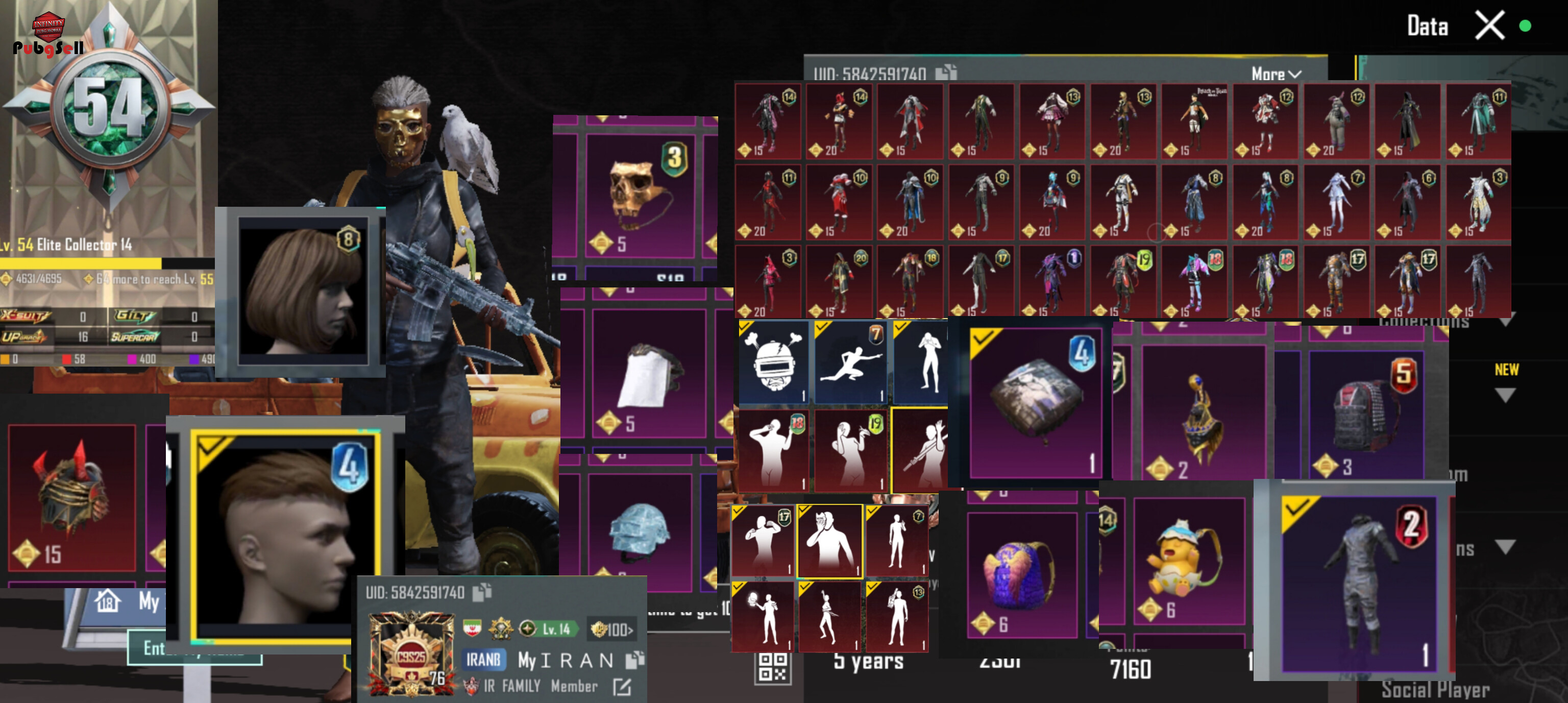 اکانت کالکشن 54 هست دارای 58 تا متیک و 16 گان آپگریدی هست. امفور یخی کیل مسیج و برای ایکس سوت جدید تا 223 تا لاکش پر شده و سیزن های جدید هم الایت هست این اکانت برای سیزن 13 هست. گان m16 معروفی هم داره مخصوصا مو های مردونه سیزن 4 و یه موی سیزن جدید هم داره.این اکانت قیمتش بسیار پایین هست و دنس قدیمی هم زیاد داره.
