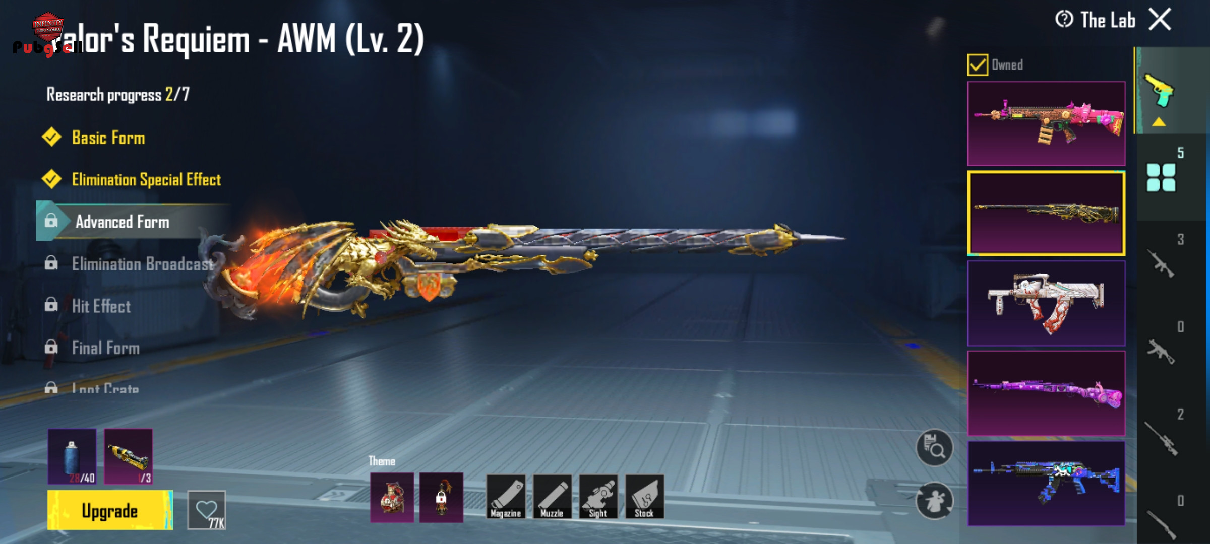5گان آپگریدی داره اسکار مکس، AW لباس آپگریدی لول 2، کار 90 مکس، گروزا لول 1 و بریل یونیکورن لول 3(advance)،3تا هم متیک فورج و یدونه هم متریال داره
