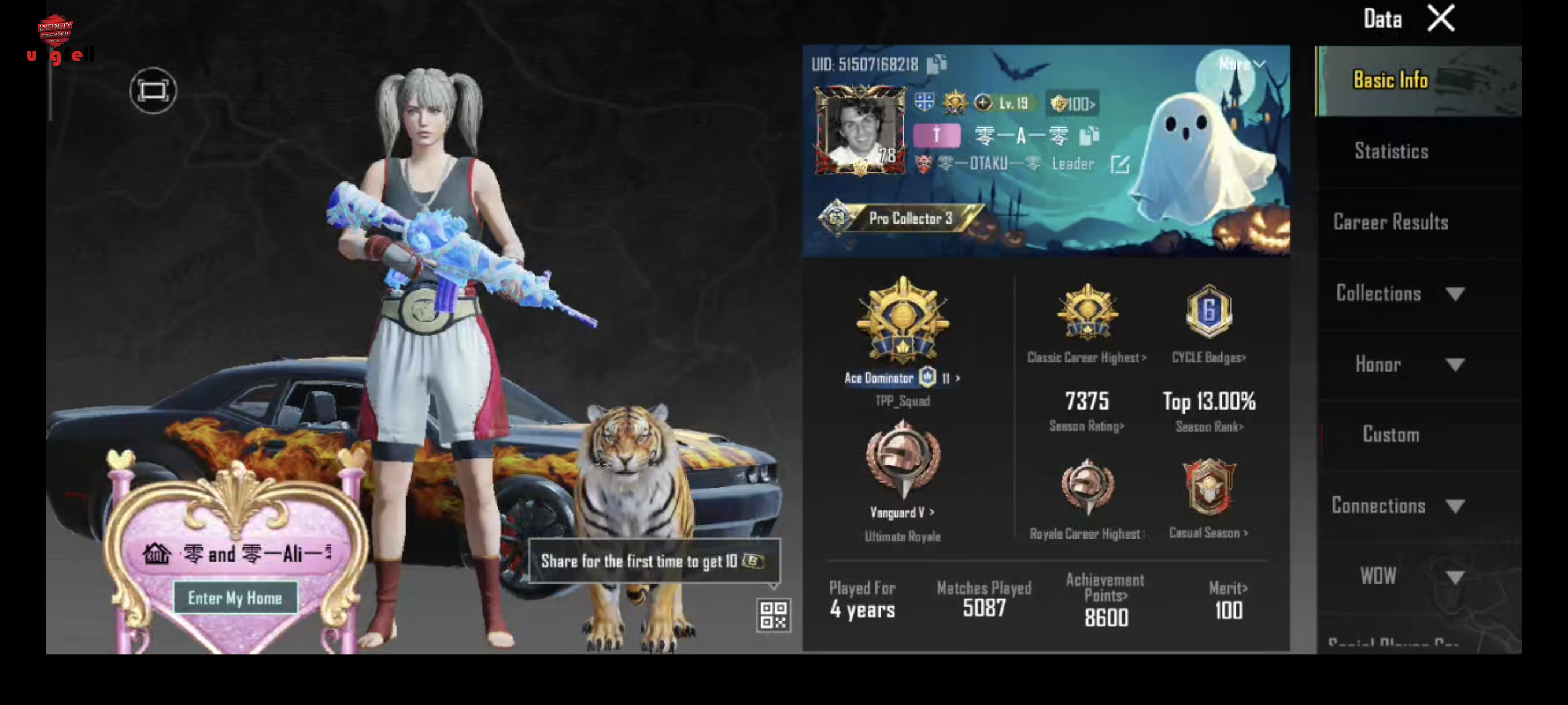 اکانت با ریجن متفاوت و قدیمی ، خوش شانس سر هر ایونت جعبه یا هر چیزی یک متیک درآورده ، دو تا اولتیمیت داره یکی ست خرگوش رباتی ، و تاج فرشته ، لباس متیک فورج 6 تا داره که 3 تاش تو جعبه درومده، 30 اسلحه آپگریدی داره که امفور مومیایی لول 4 کیل مسیج ، ای دبل زنبوری کیل مسیج لول 4 ، ام 24 فرعون لول 4 ، پیستول مکس ، ام 24 دزدان دریای لول 3 ، تامسون مکس ، ام جی ال مکس ، گروزا لول 4 و بقیه لول 1 هستند ، دوج 2 نفره آتشین رو داره ، و اسکسن ماشین آپگریدی 1 متور ، دو تا پیکان ، 1 تراک ، 1 جیپ ، 1 باگی و 5 کاراکتر داره ویکتور ، سارا ، آنا ، riely، لورنزو، که همه مکس لول هستند ، 7 تا متیک فورج و 22 تا نم مینیش رو داره، 208 تا لاکی کوین هم داره ، پت پلنگ هم داره و لباس شیر ، لول خونه هم 30 هستش ، فیس سزن 4 داره و گیس خرگوشی و موی سر سیزن 4 ، اسکین لباس سیزن های قدیمی زیاد داره ، 3 مینی متریال داره ، لول کالکشن هم بین 64 و 63 هستش که به 64 نزدیک تره ، قاپ 1 سالگی پابجی رو هم داره با کلی قاپ جفن دیگه ، و لول اچیومنت 8600 هستش و کلی تایتل جدید و قدیمی داره