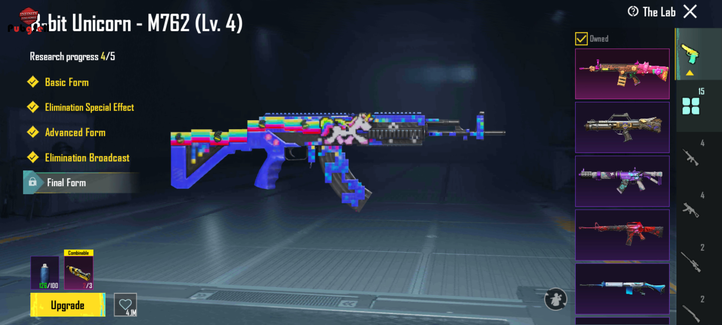 دارای 15 گان اپگریدی که 6 تا کیل مسیج هست، با 25 تایتل و کلی فریم خفن