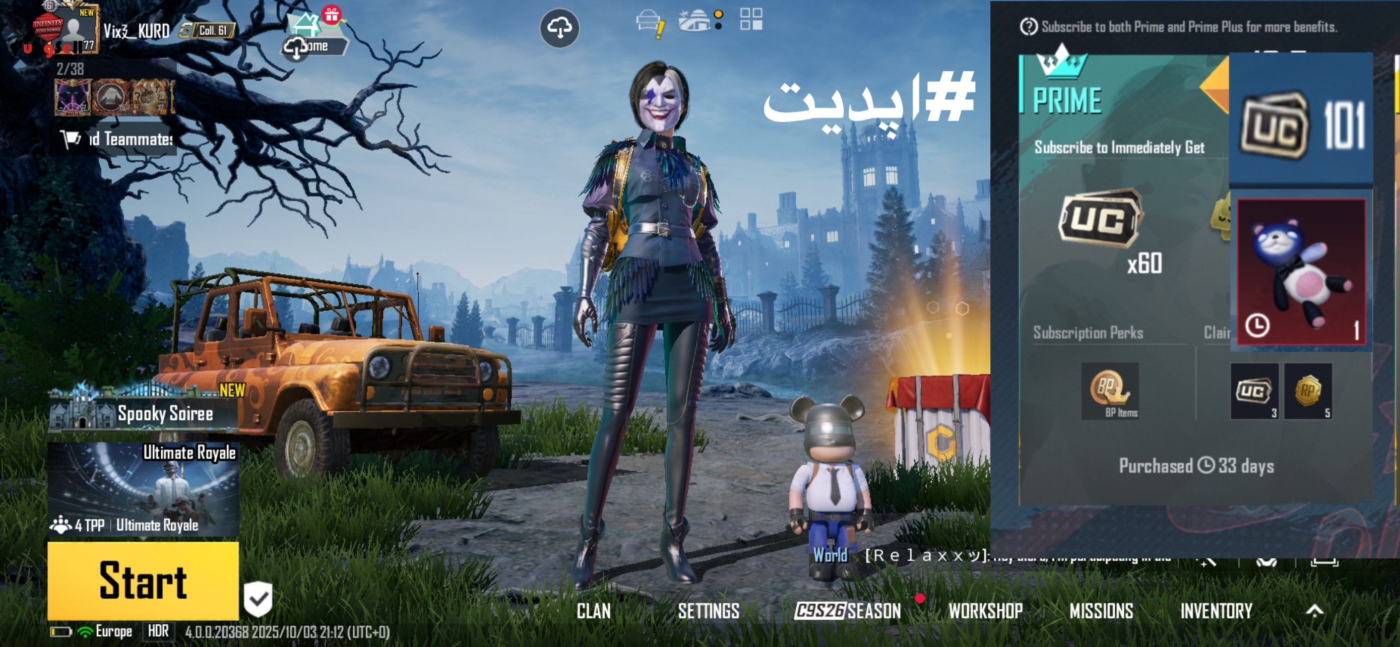فقط لینک 3 -اکانت اپدیت شده 101یوسی داخلشه با یک جم کامل التیمت فعلی با 33روز پرایمفعال هر روز 3یوسی به شما میده -اکانت دارای 7مینی مت 2جم کامل و 17تا شکسته هست کالکشن 61 -ست های غیر ارپی زیادی داره ماسک جوکر اصلی رو داره امفور طلایو داره ایتم و کیف فرعون تا دلت بخواد هست -اندی ،سارا ،انا باز هستند -پت عروسک پابجی و پت گربه رو دار --------- 18 تا اسلحه ارتقای چندتای کیل هستند 8-bit Unicorn - M762 (Lv. 4) Operation Tomorrow - SCAR-L (Lv. 4) Soaring Dragon - MG3 (Lv. 4) Cadence Maestro - M24 (Lv. 4) Marine Evolution - UMP45 (Lv. 3) Tundra Knight Dagger (Lv. 3) Drakonbane Remnant - Machete (Lv. 2) Codebreaker - AKM (Lv. 1) Bunny Munchkin- AKM (Lv. 1) Circus of Screams - Crossbow (Lv. 1) Faerie Luster - Pan (Lv. 1) Panthera Prime - DBS (Lv. 1) Lilac Finesse - Thompson SMG (Lv. 1) Nightscape Gladiator - PP-19 Bizon (Lv. 1) Seadream Melody - SLR (Lv. 1) Spirit Sentry - UZI (Lv. 1) Thornrose Dawn - MIGA4 (Lv. 1) Patchmetal Bunny - Mk47 (Lv. 1)