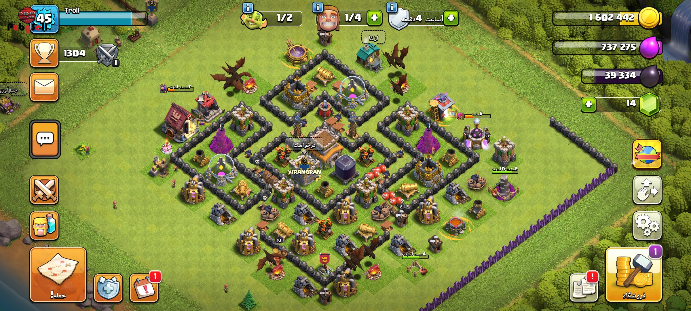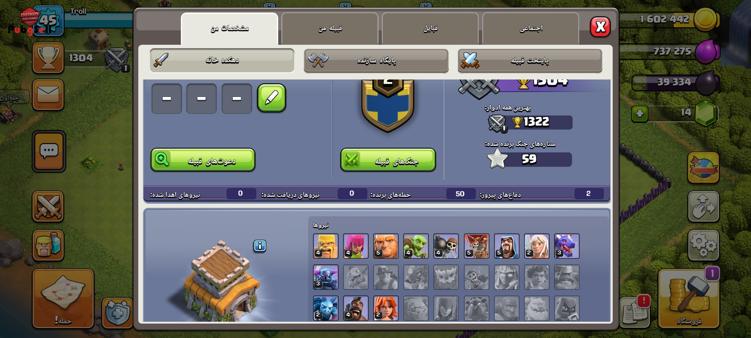 اکانت کلش آف کلنز لول 45 تان هال 8 نیمه مکس یک کلن همراه آن که لول دو هست