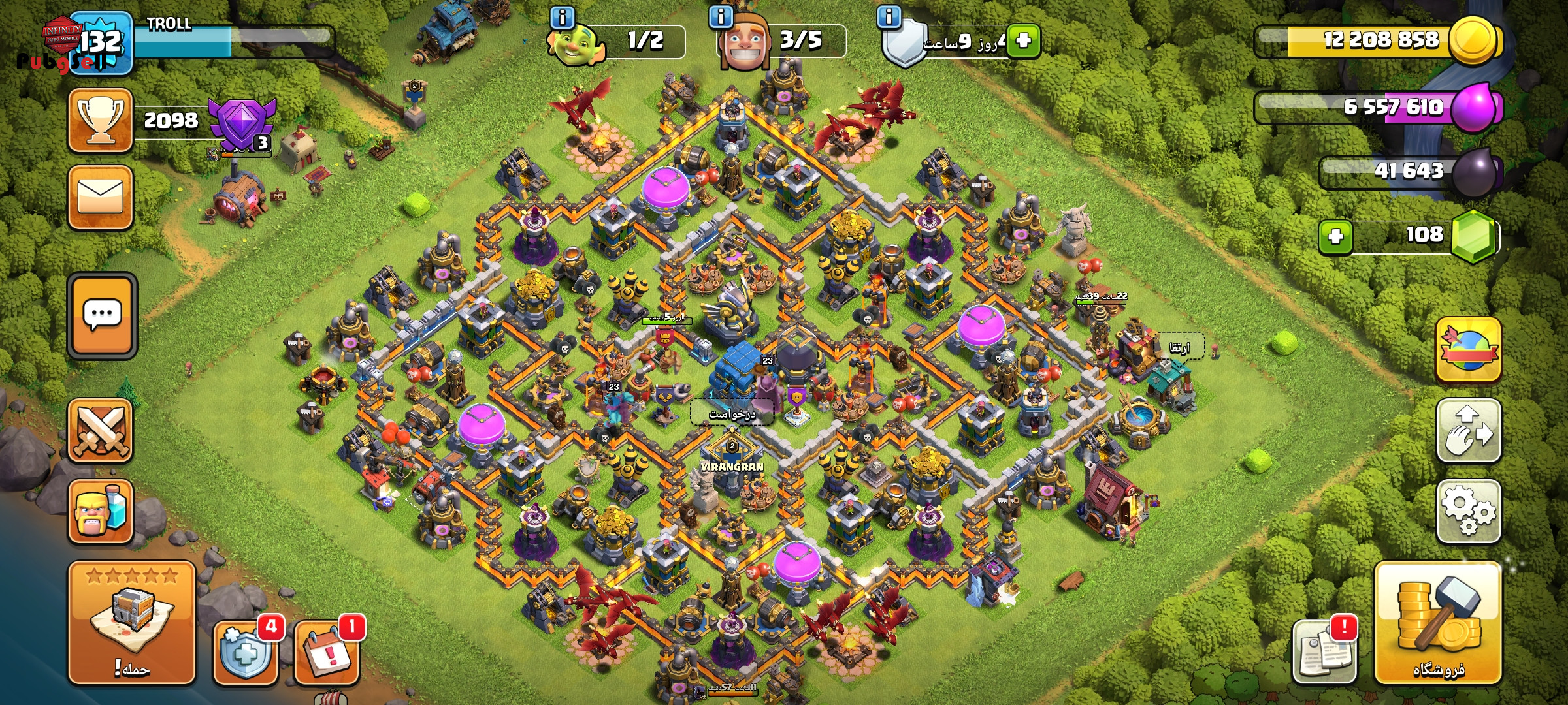 اکانت کلش آف کلنز لول 132 دارای پنج کارگر تان 12 همچی مکس لیگ کریستال