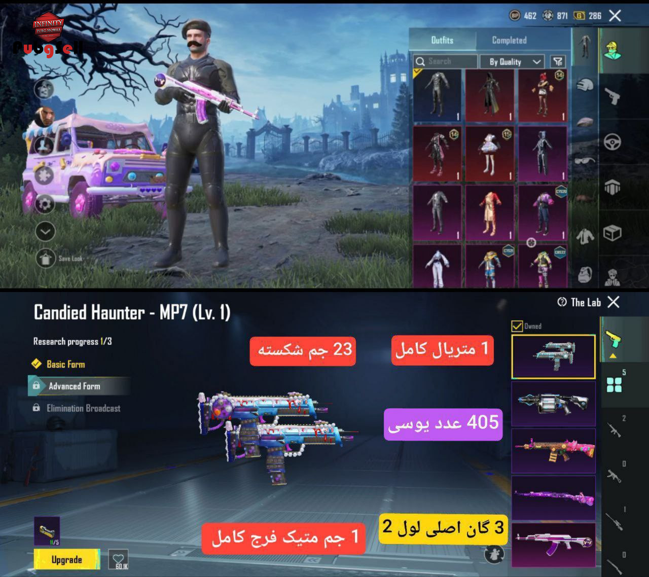 🎖 آیتم های مهم : اکانت خوش شانس دارای 5 ارتقایی کلاش خرگوشی و 405 یوسی لباس متیک داره کارکتر ویکتور لول 6 1 متریال داره 1 جم متیک فرج کامل و23 جم شکسته و 50 تا جعبه طلای گان میشه گرفت کالکشن 30 ماشین جیپ صورتی خفن