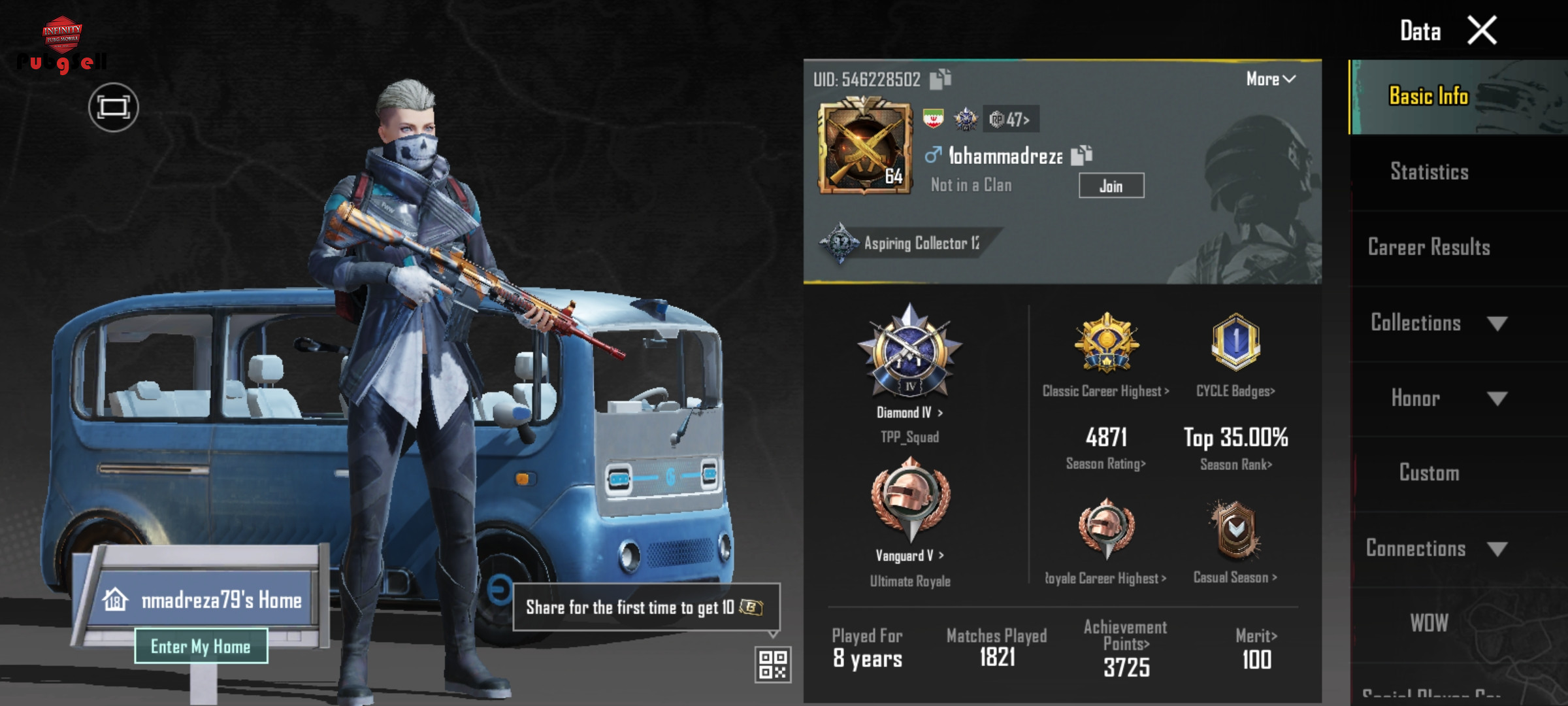 🔱🔱🔱 قدیم ترین اکانت پابجی موبایل و یک فرصت استثنایی 🔱🔱🔱 همین طور که داخل عکس مشاهده می کنید این اکانت هشت سال پیش ساخته شده دقیق بخوام بگم همون روز اول بیرون اومدن بازی این اکانت بوجود اومده سیزن فول نداره ولی سیزن های s2, s3, s4, s6, a2, a9 تقریبا تا لول 80 رفته قدیمی ترین و محدود ترین اسکین های لباس و گان همون طور که داخل فیلم می بینید وجود داره ایموت های (رقص) قدیمی که هیچکس نداره داخل ویدیو موجوده اکانت 16 بار دایموند، 6 کرون، 3 ایس، 1 آیس مستر، 1 آیس دامینتور شده تمام آیتم ها داخل ویدیو موجو است