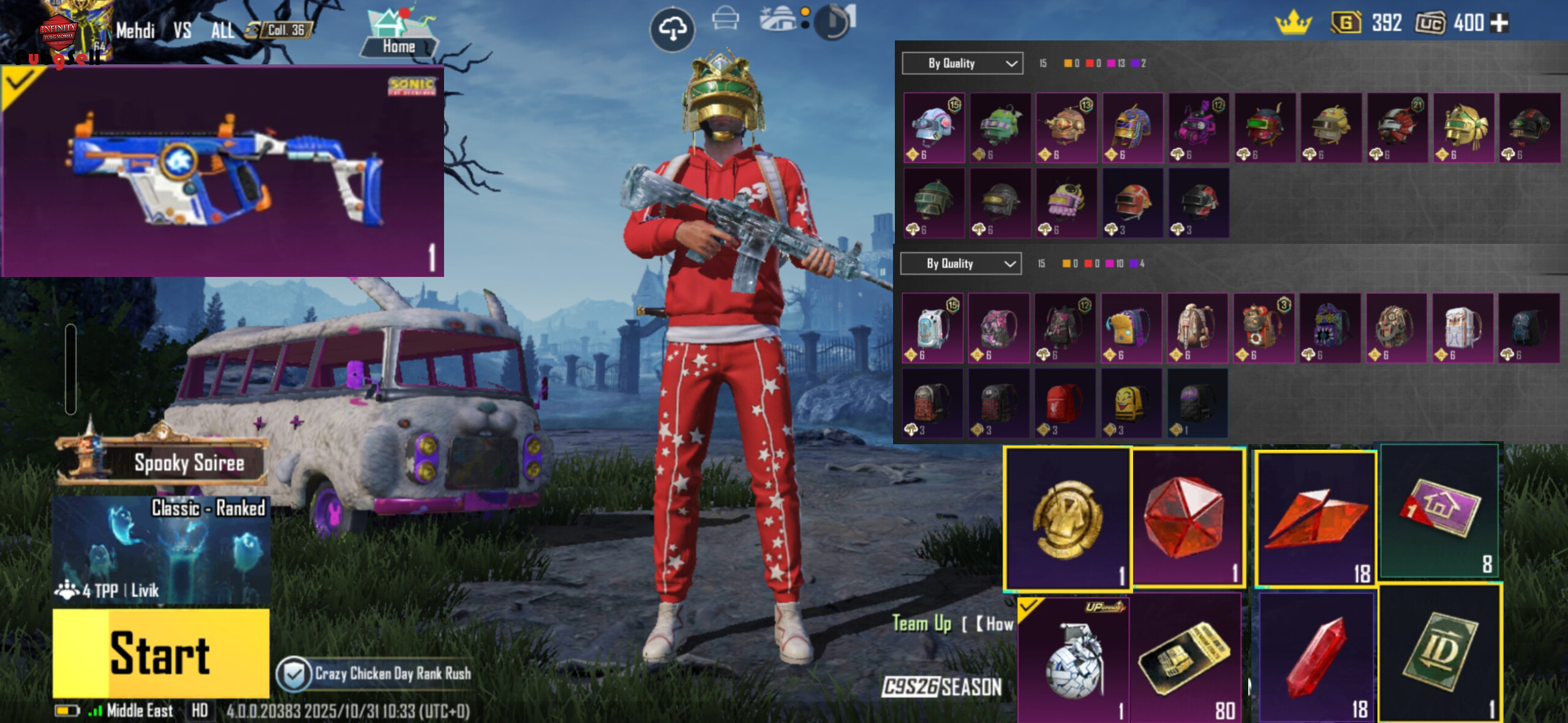 لول اکانت:64 ,400تا UC لول کالکشن:اخرای36 3 سیزن الایت مکس A12/A13/A15 ی لباس متیک همراه با دنس خفنش،هلمت و دنس و قاب و smok و p90 فرعون اکانت خوش شانسیه با 10 یوسی ویکتور سونیک رو در آورده با 10 یوسی نید اسکارل التیمیت گان های اپگریدی امفور یخی (Lv.3) P90فرعون (Lv.2) UMP45پرتغالی (Lv.1) تیرکمان (Lv.1) MP7 RP (Lv. 1) NS2000 RP (Lv. 1) Mk47 RP (Lv. 1) 80 تا جعبه طلایی داره که سیزن بعد گان رو میتوی بگیری یک جم متیک فورج با 18 تا شکسته 5 تا مینی متریال یدونه سیلور طلایی کارت تغییر نام:دارد