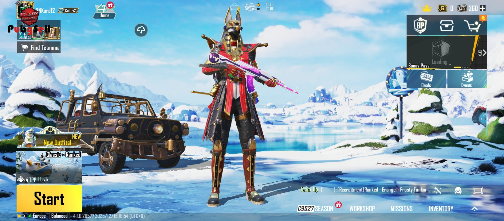 لیول 68 ازسیزن A8پلی داده شده واز سیرن A11 الات تا الان و دارای Akmخرگوشی لیول 3 3 مینی متریال دیگه کیل مسیج میشه و ام700لیول 3 شات گان لیول 2 شاتگان 5 گولوله لول 1 وی ام پی لیول یک اسکارل لیول یک وی اس اس لیول یک 2 نوع ام 16 لیول 1 کولت لیول 1 دارای دو ست مهم جعبه فرعون کوکتل مولوتوف ابگردی بمب فرعون کلاه سیزن 2 کفش سیزن 2 خرگوش دی پی سیزن 1. 22 متیک 3متریال و7 مینی متریال کالکشن 42 75 اسپری